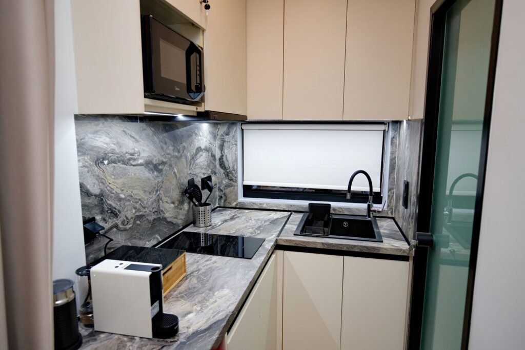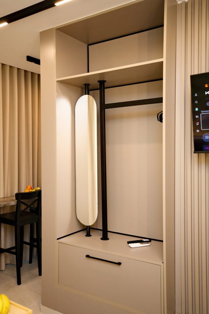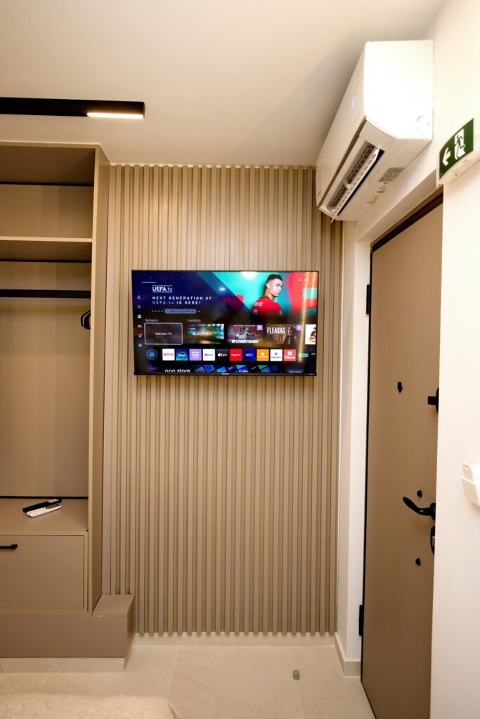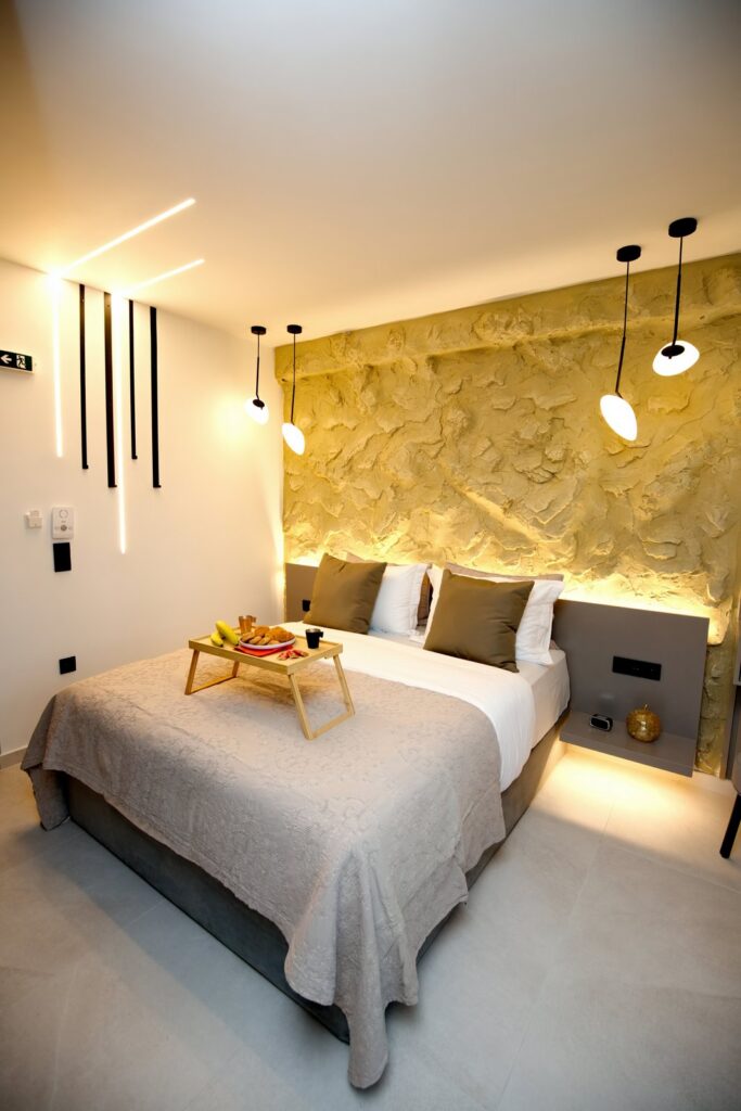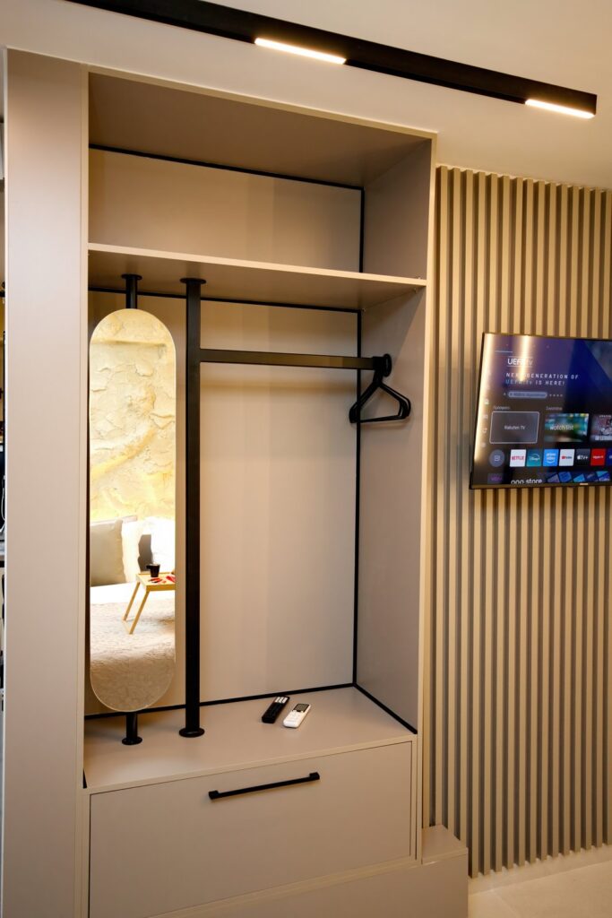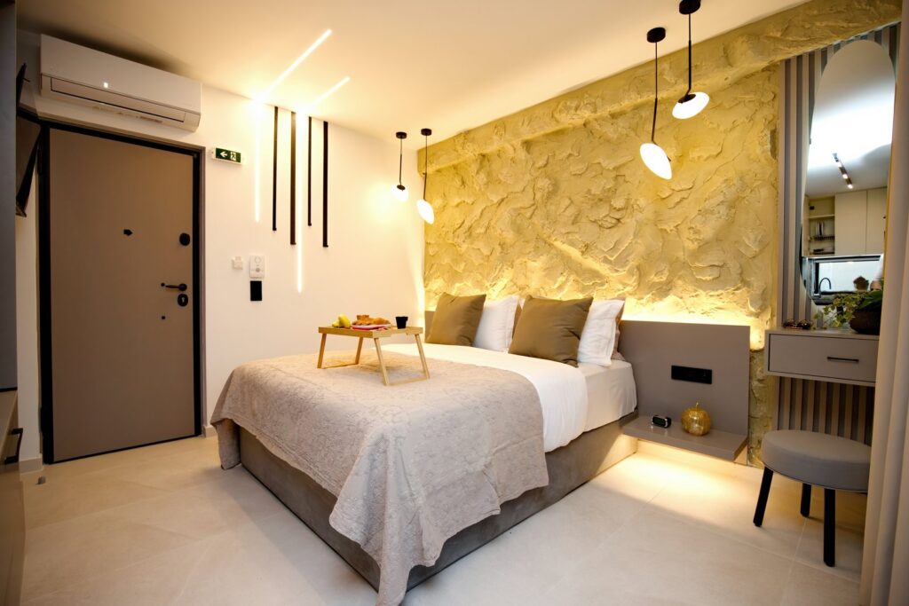 Διαθέτει διπλό κρεβάτι (queen), μοντέρνο μπάνιο, πλήρως εξοπλισμένη κουζίνα, έξυπνη είσοδο, κλιματισμό και συσκότιση στα παράθυρα για απόλυτη άνεση.
